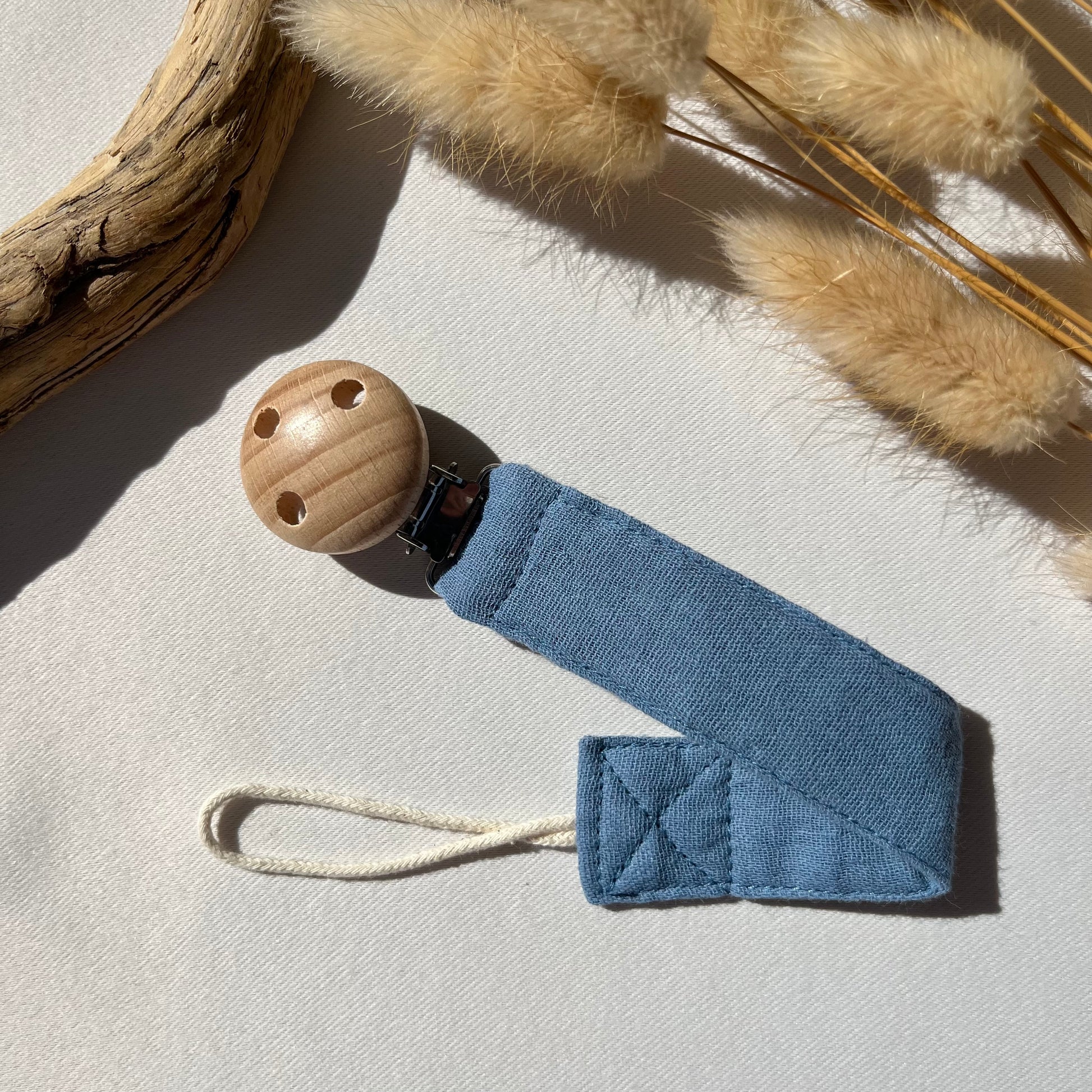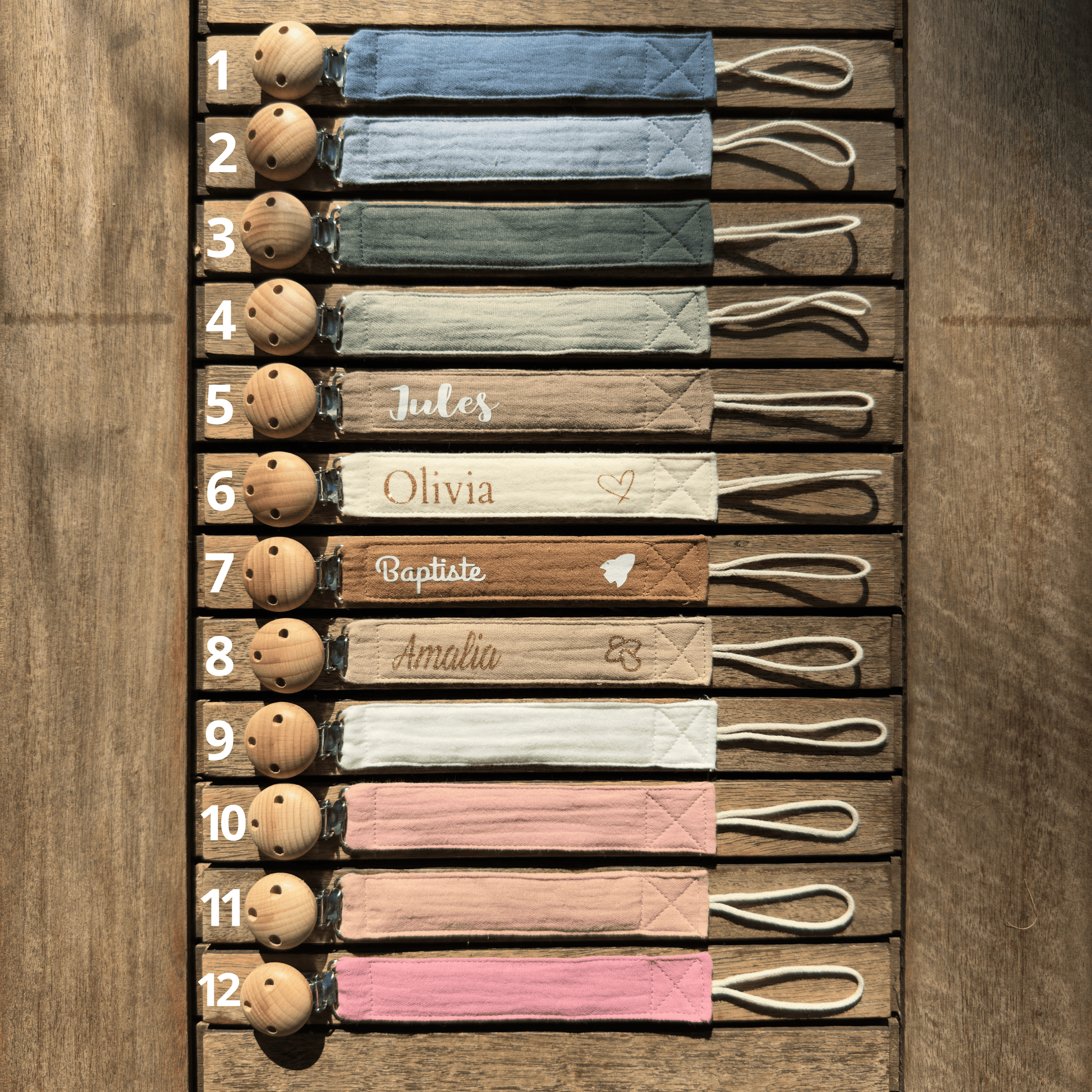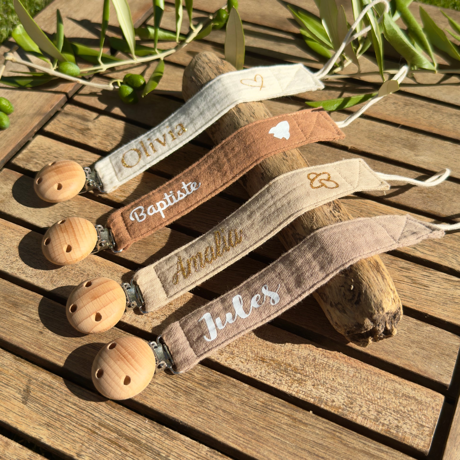 🧸Attache tétine personnalisée en gaze de coton avec attache en bois naturel.